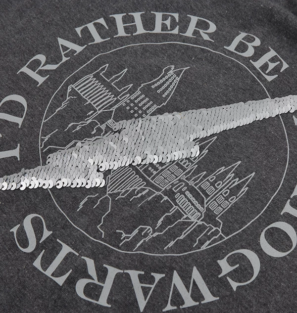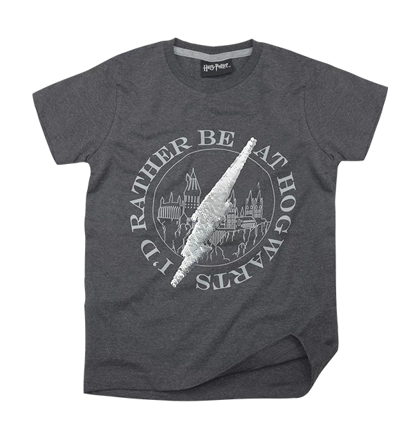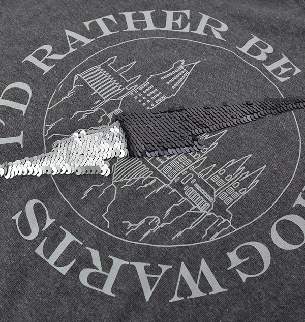 This stunning dark grey shirt has a centre image of Hogwarts Castle, surrounded by the slogan “I’d rather be at Hogwarts”. Across the image of the castle, you can find a sequin lightning bolt. This embellishment is reversible; if you brush the sequins in one direction, the lightning bolt becomes silver. If you brush in the other direction, they become black.