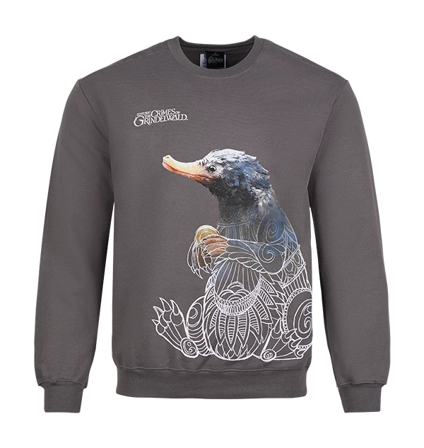 This grey crew neck jumper features a sketch design of a Niffler, which merges beautifully into the Niffler design that we know and love from the Fantastic Beast films. It also features the Fantastic Beasts: The Crimes of Grindelwald logo.