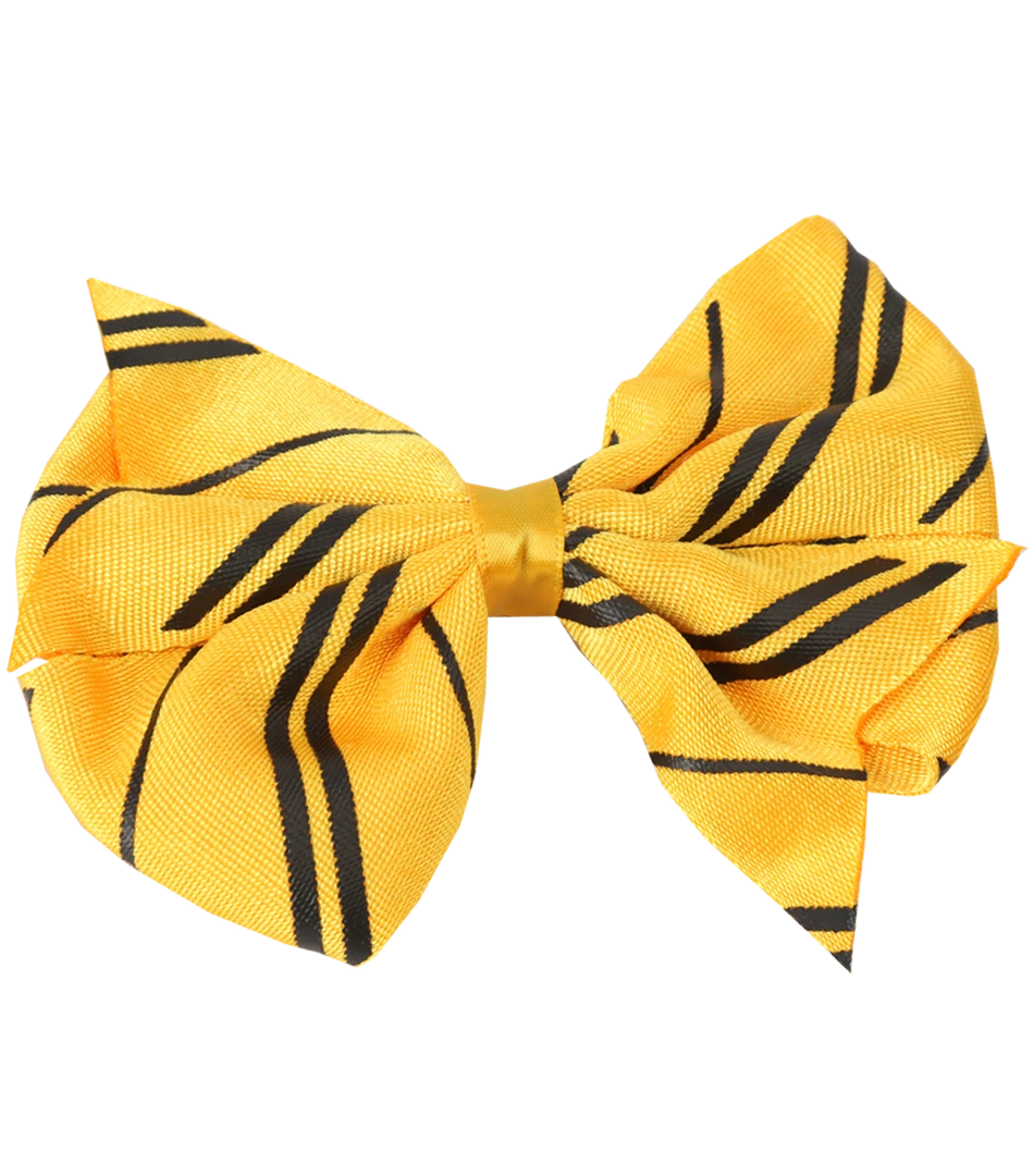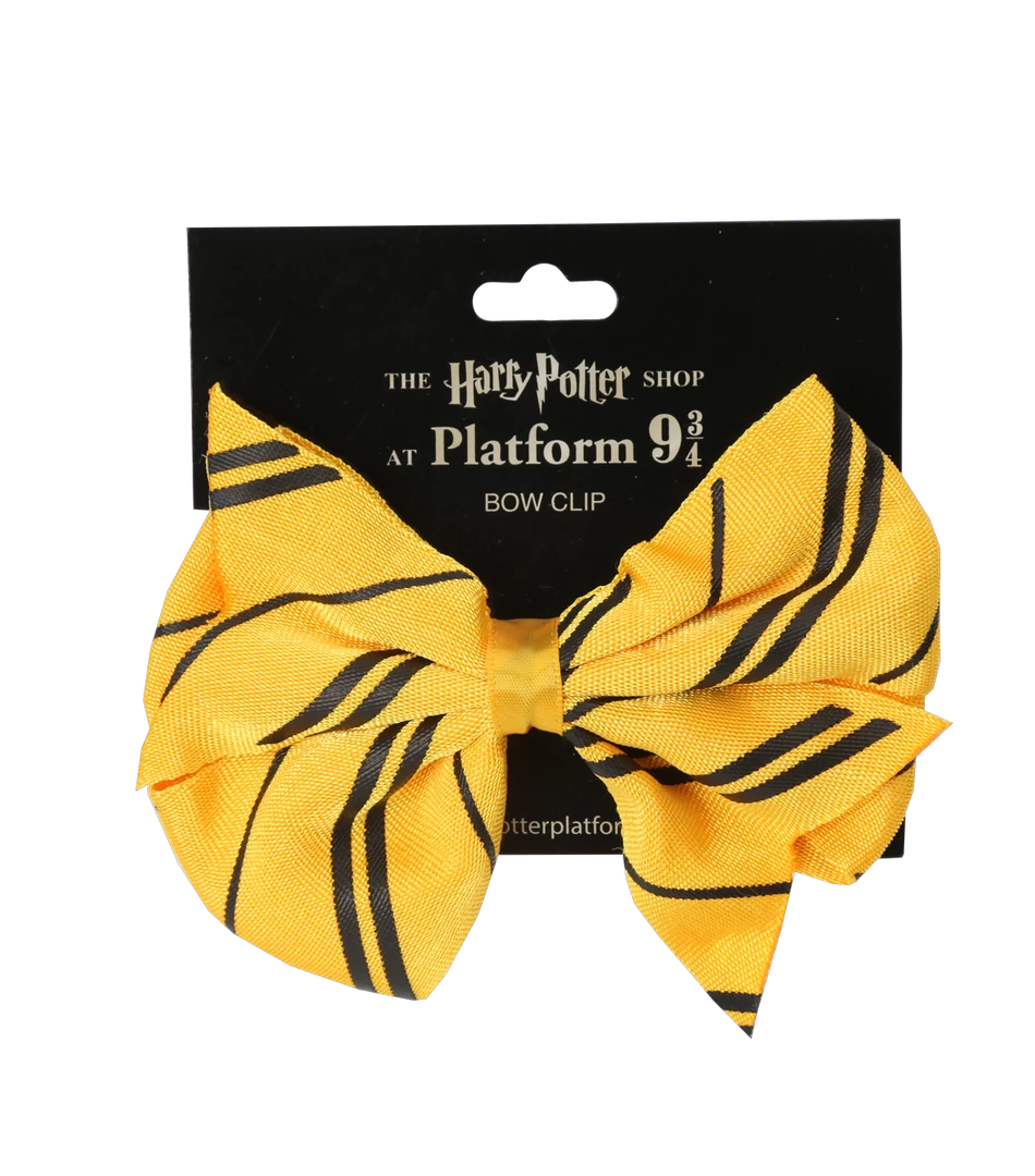 A beautiful bow clip in the traditional Hufflepuff house colours of yellow and black. Features a clip on the reverse of the bow to fasten into place. Bow clip measures approximately 11cm x 9cm.