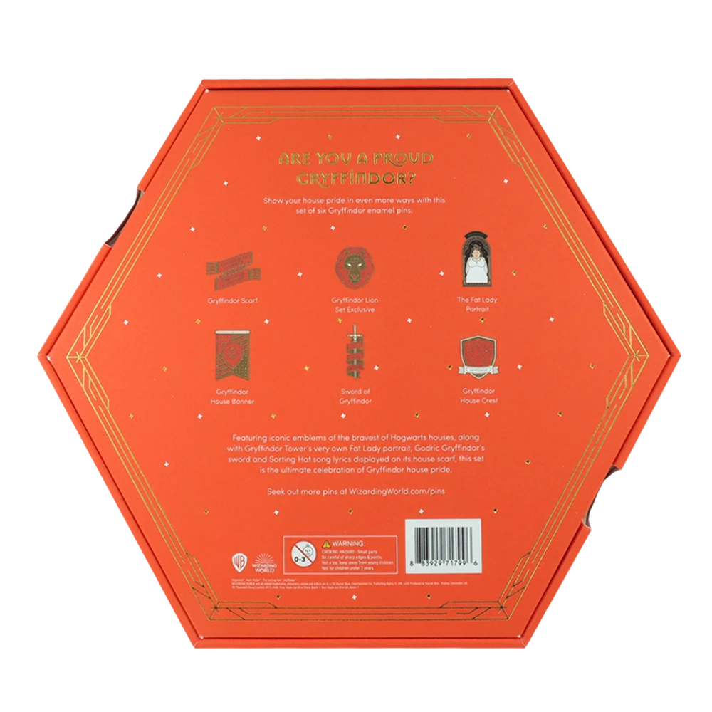 Start your Harry Potter Fan Club Pin Seeking collection with this Gryffindor house pin set. This 6-pin set includes the Gryffindor house crest, Fat Lady portrait, Gryffindor house banner, Sword of Gryffindor, Gryffindor scarf, and an exclusive pin available only when you purchase this set – the Gryffindor lion! Each pin is finely detailed and is themed around the house colours, making it the perfect gift for all Gryffindor fans.