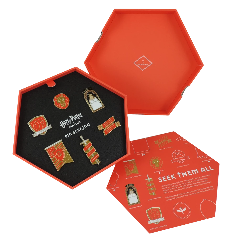 This red and gold 6 piece First Edition Gryffindor Enamel Pin Set is part of the Harry Potter Fan Club Pin Seeking collection and features a rare pin that can only be found in this set. The box is fitted with magnets so you can connect your box with other box sets as you grow your pin collection!