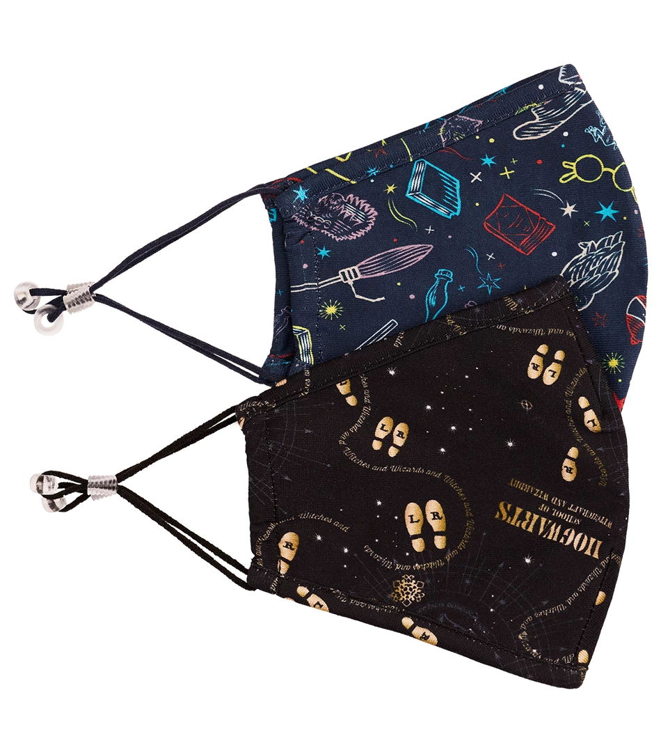 One mask includes a Marauder’s Map design on a black background, and the other is made up of bespoke designs of a broomstick, journal, and Harry Potter’s iconic glasses on a navy background. The masks include an adjuster and stopper, for a better and more comfortable fit.