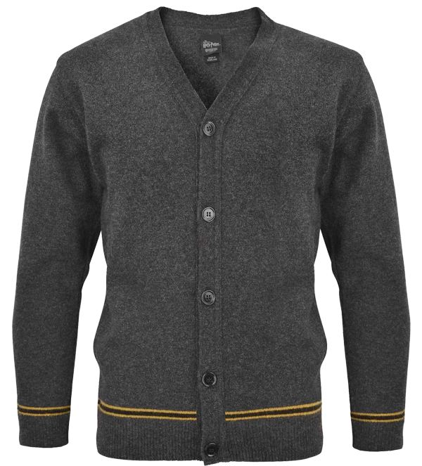This charcoal V-neck Hufflepuff cardigan is knitted and assembled in the Scottish Mill that made the costumes for the cast and extras in the Harry Potter film series.