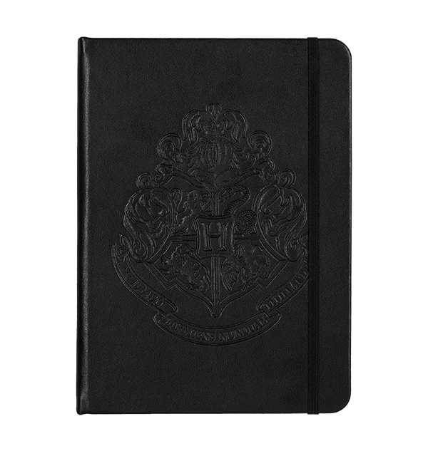 This Hogwarts notebook features parchment-like textured pages and an embossed Hogwarts crest on the faux-leather cover.Â