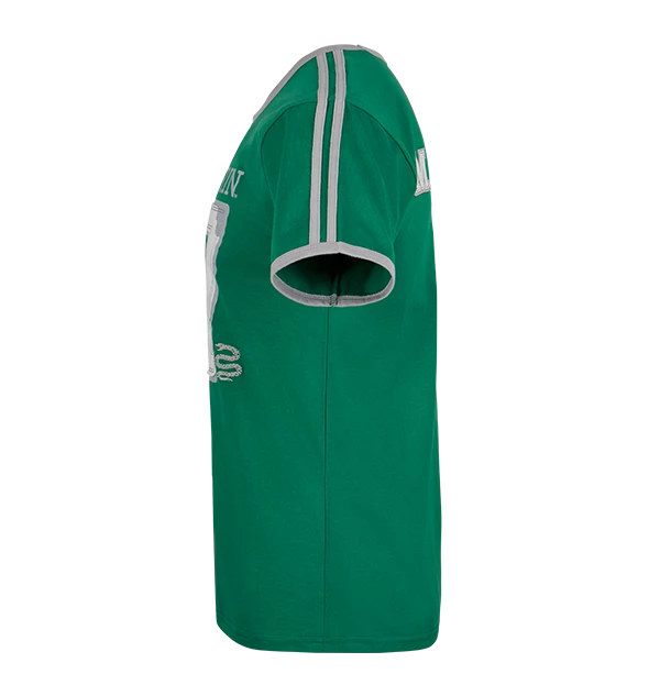 Celebrate your Hogwarts house loyalty with this bespoke Slytherin House Seeker T-Shirt. The short-sleeved t-shirt comes in the traditional house colour green which is combined with grey stripes along each sleeve. The number 07 is printed in a grey and white design in the centre of the t-shirt alongside the word Slytherin which is printed across the chest in grey. This personalised Slytherin t-shirt is complete with an embroidered grey serpent, the iconic Slytherin house animal.