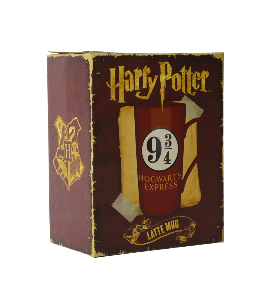 A red latte mug featuring the Platform 9 3/4 and Hogwarts Express logos.
