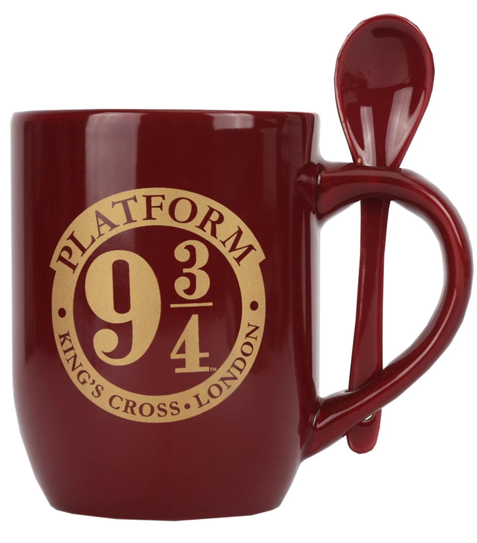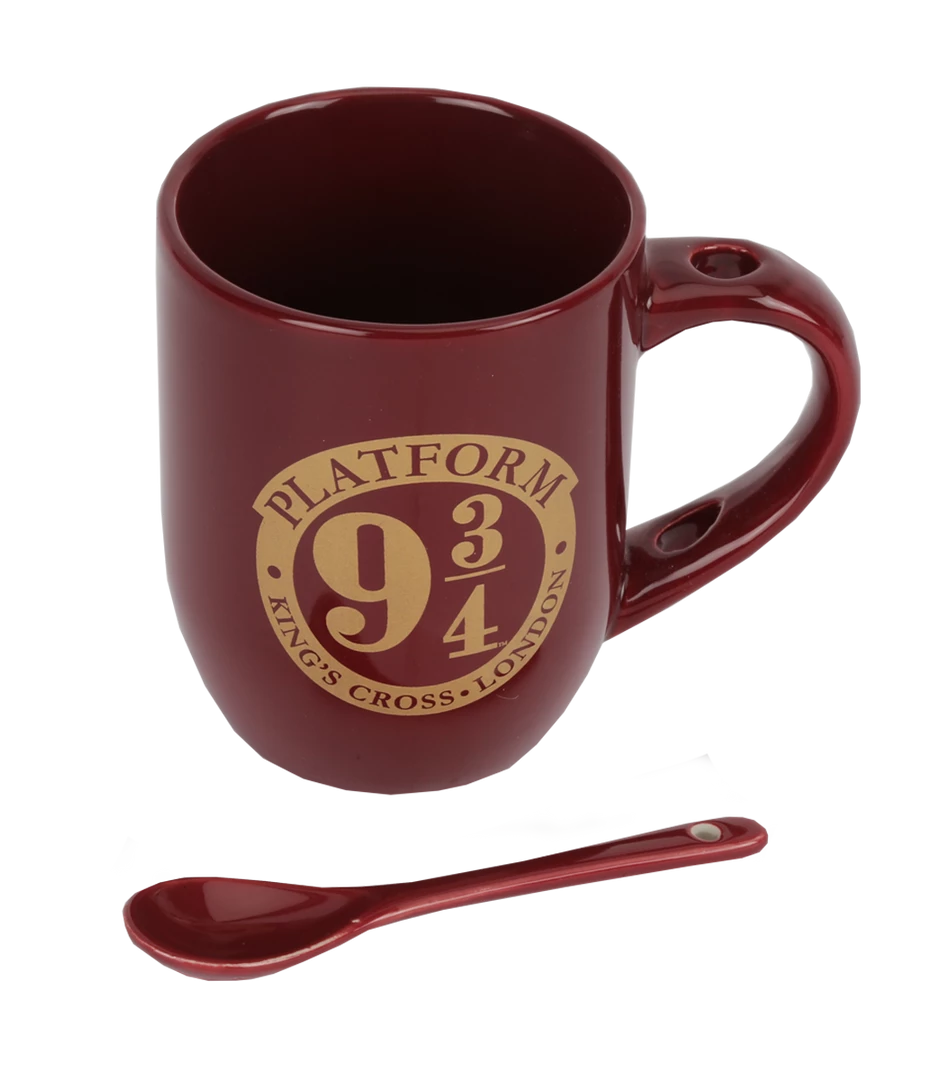 This exclusive burgundy mug features a gold Platform 9 3/4 logo and comes with its very own spoon.
