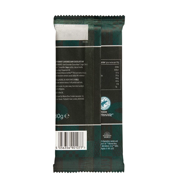 The chocolate bar comes in bespoke packaging which features an emerald green and grey design, the traditional colours of the Slytherin house. Take home your very own chocolate bar, straight from the Hogwarts Express Sweet Trolley.